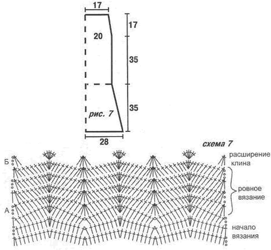 Далее провяжите ряды, на которых вы выйдите на ровную часть клина. Затем вязать ровную часть клиньев на высоту 5 см, после чего выполнять расширение клина. Для этого в месте регулярных прибавок свяжите 7 столбиков с/н вместо 5-ти, а в месте убавок по-прежнему вяжите 5 незаконченных столбиков. Между прибавками и убавками вяжите столбик в столбик. Следующую прибавку выполнить на расстоянии примерно 6 см от предыдущей, и ещё одну прибавку - через 7 см.