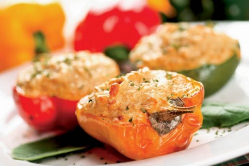 Перцы разрезать вдоль и извлечь семена. Заполнить их получившейся начинкой. Выложить на смазанный противень и поставить запекаться в разогретую духовку на 30-40 минут.